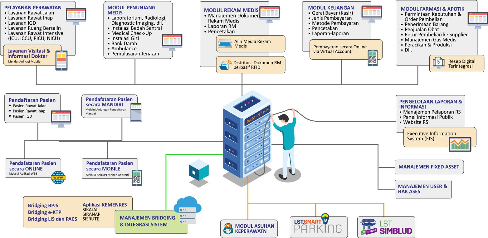 Seluruh modul & aplikasi SIMEDIKA merupakan suatu rangkaian aplikasi yang terintegrasi dengan seluruh bagian di rumah sakit, baik data yang berupa dokumen medis, administrasi dan keuangan. Sehingga seluruh data/dokumen terkait dengan pasien, dokter, perawat dan staff rumah sakit, terangkum baik dalam sistem informasi manajem rumah sakit.
